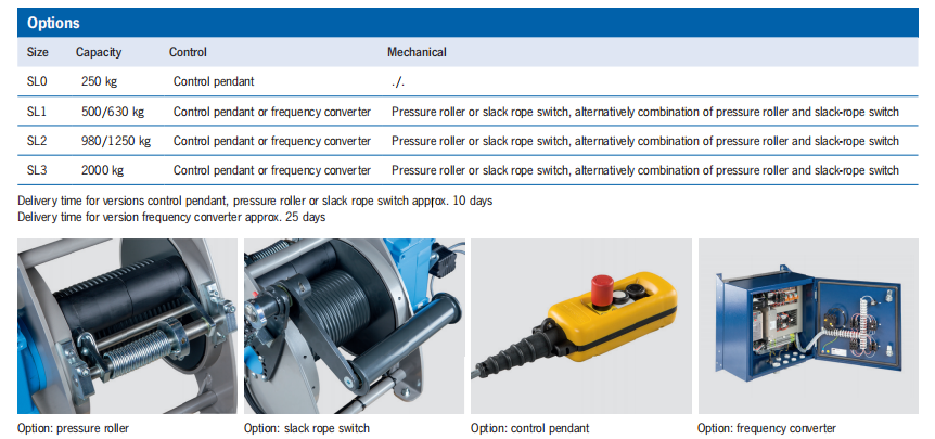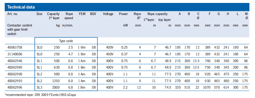 永久可靠,由于封閉的蝸桿齒輪對或馬刺齒輪配備高質量的制動電機。電線繩絞車貝塔SL 隨接觸器控制系統(包括齒輪限制)一起提供開關。
